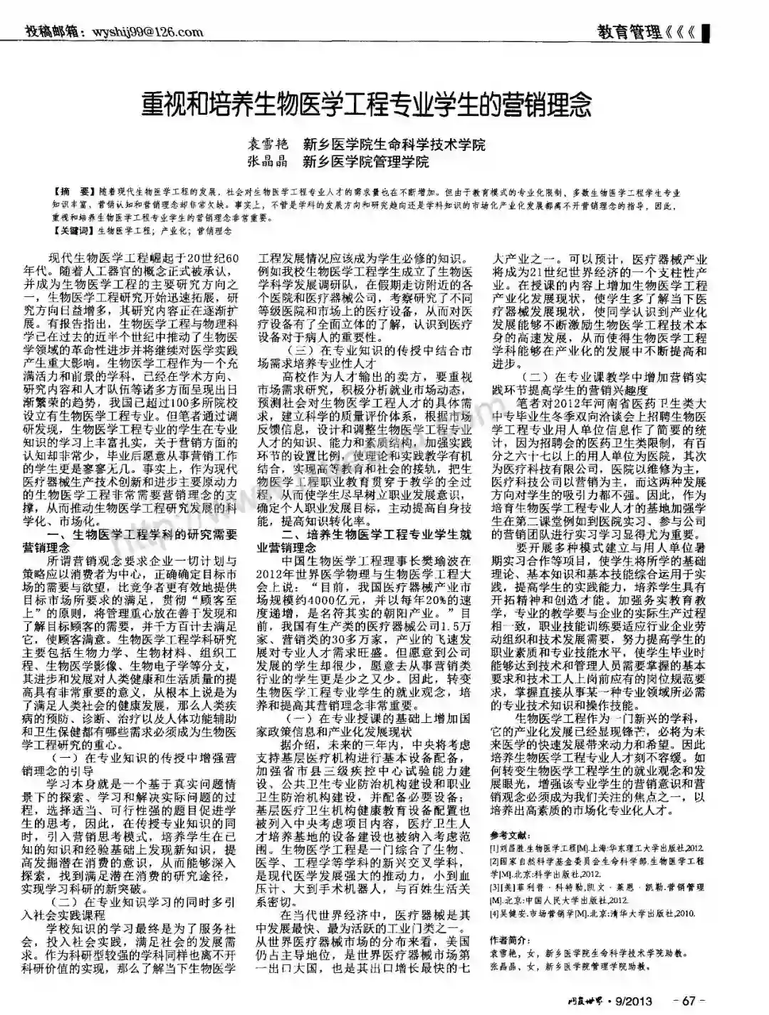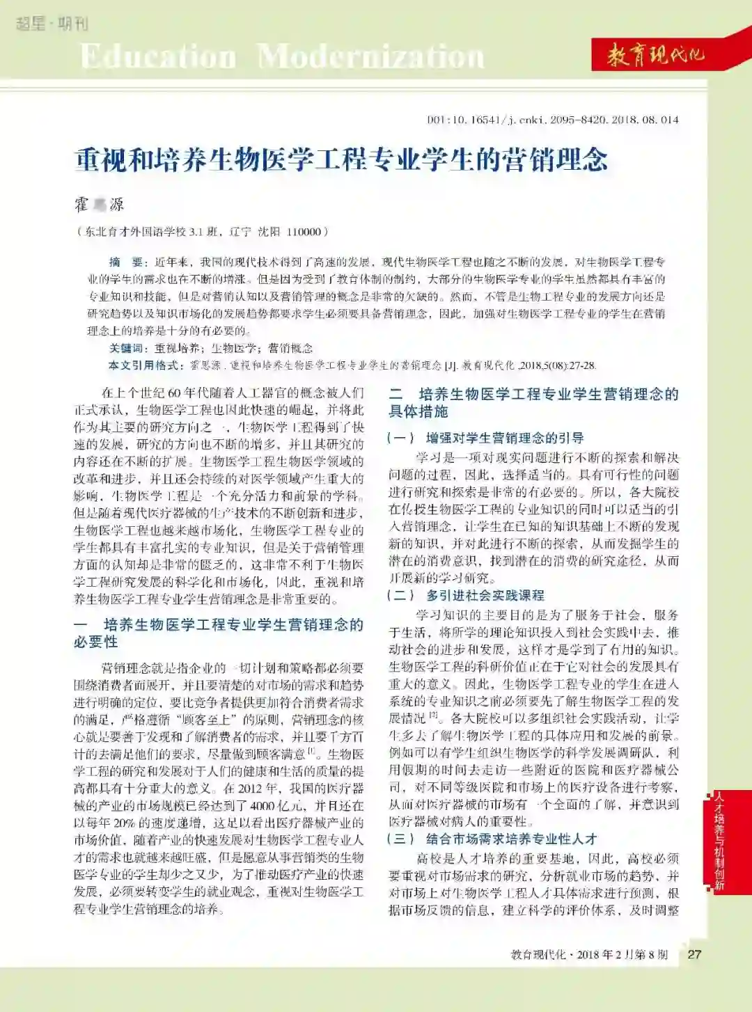 1、东北育才外国语学校霍同学的“重视和培养生物医学工程专业学生的营销理念”(发表于《教育现代化》)