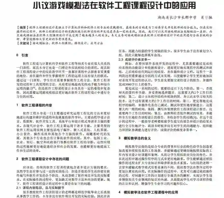 3、长沙长郡中学肖同学的“小议游戏模拟法在软件工程课程设计中的应用”(2018年2月发表于《电子世界》)