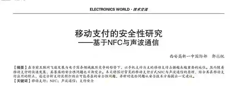 2、西安高新一中郭同学的《移动支付的安全性研究 ——基于NFC与声波通信》(2017年2月发表于《电子世界》)