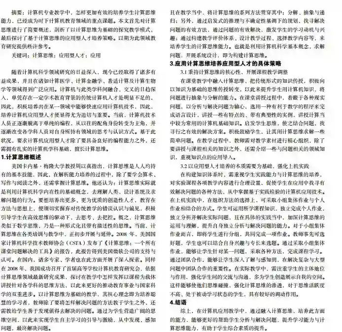 4、电子科技大学实验中学张同学和成都七中肖同学的“计算思维在计算机应用型人才培养中的应用”(2017年8月发表于《电脑迷》)涉嫌抄袭湖北文理学院袁磊等人于2014年2月发表在《计算机时代》的“计算思维在计算机应用型人才培养中的应用探索”。
