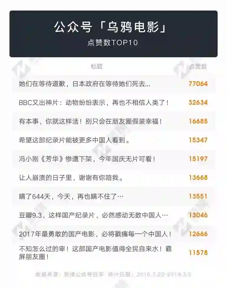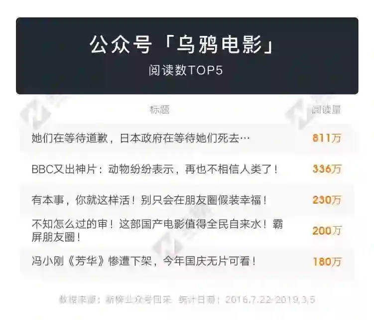 据新榜公众号回采,「乌鸦电影」自2016年7月至今共发文896篇,其中包含511篇10w+。