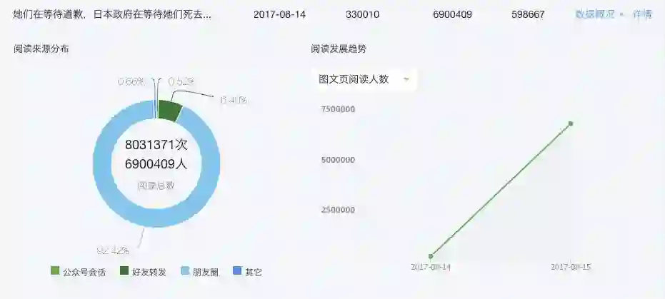 最为人所知的是他们在2017年8月推送的那篇《她们在等待道歉,日本政府在等待她们死去…》。文章意在为当时排片量仅1%的国产电影《二十二》发声,发布两天阅读数就达740万,带来18万涨粉,一时成刷屏爆款。