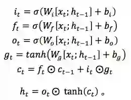 Recurrent model 的选择则比较丰富,不仅仅限于 RNN(包括变种 GRU、LSTM、SRU 等),还可以是一维卷积 CNN,或者是纯粹的 Attention model。以最流行的 LSTM 为例,它通过引入 additive memory 和 gate 来缓解简单 RNN 的梯度消失问题: