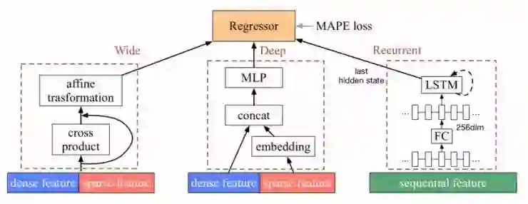 其中,Wide 和 Deep 模块对行程的整体信息进行建模,而 Recurrent 模块对行程的轨迹进行细致的建模,可以捕捉到每条 link、每个路口的信息。在最终汇总时,Wide 模块通过仿射变换把输出变到合适维度,Deep 模块直接把顶层 hidden state 作为输出,而 Recurrent 模块将 LSTM 的最后一个 hidden state 作为输出。三个模块的输出向量被拼接起来,进入最终的 Regressor 进行预测,得到 ETA 值。全部参数都基于 MAPE loss 做梯度下降来训练。