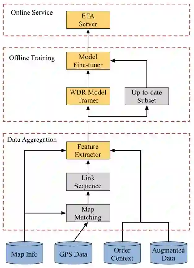系统架构如下图所示。最底层为数据源,分别是地图信息、GPS 轨迹、订单记录和其它必要的附加信息。然后,原始数据经过特定的处理,变为模型可用的格式,用于训练模型。注意这里有一个小分支,表示在训练完成之后还单独取出了一小批 up-to-date 数据进行 finetune,使得模型更倾向于最新收集的数据。线下训练好的模型,最后被推送到线上系统,对外服务。