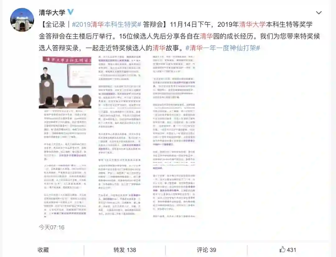 据清华大学微博消息,11月14日下午,2019年清华大学本科生特等奖学金答辩会在主楼后厅举行。15位候选人先后分享各自在清华园的成长经历。