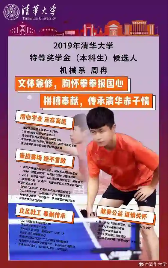 机械系的周冉,在机械系三年推研成绩总排名第一,38门课程学分绩4.0;获得清华大学综合优秀奖,以及蒋南翔奖学金。