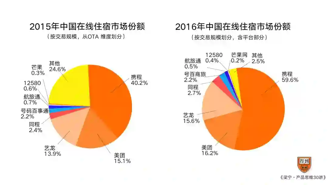 完成对对手的并购之后,解决了价格战问题,携程进一步发展。以酒店一项,2015年携程一家是占40%,2016年进一步扩大了优势,携程一家占到60%的市场份额。美团大概占了16%,艺龙15.6%,其他人都消失不见了。