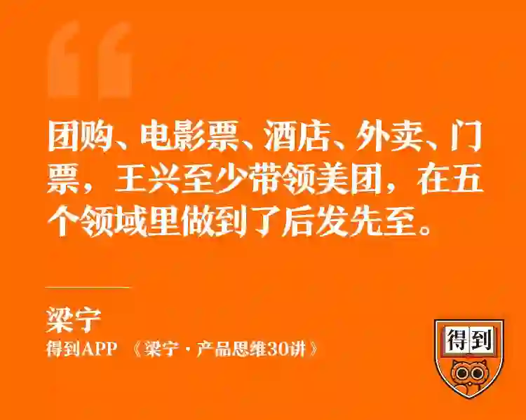 王兴领导的美团,至少完成了五次以上的后发先至。团购、电影票、酒店、外卖、景区门票这些业务他都不是第一个做的,但是至少在这五个领域里,他连续做到了后发先至。