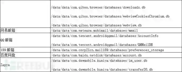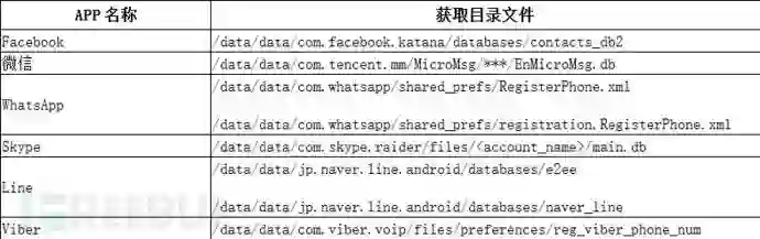 为了从以上APP中收集隐私数据,SpyDealer首先向目标APP目录中释放一个名为dealapp 的可执行程序,并利用root权限拷贝为/system/bin/dealapp文件,之后,该文件就负责在目标APP中进行各类信息数据收集。其所收集数据信息,不只限于数据库文件,还包括配置文件和其它特殊文件。具体如下: