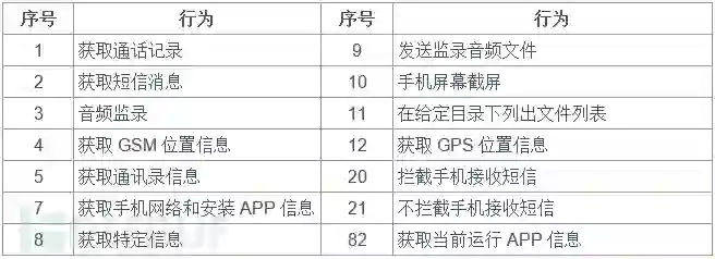 通过这种UDP/TCP协议信道,攻击者可以对感染手机执行多达45种操作指令(详见报告),指令行为涵盖个人信息收集、监听监视和远程代码执行等。