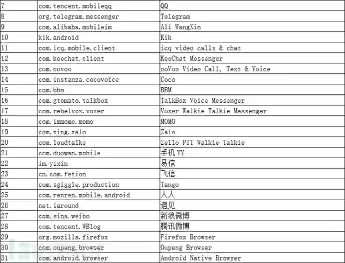 如前所述,SpyDealer结合root提权,使用多种方式收集数据,这些数据信息涉及40多个流行APP中所含的社交通信信息、通讯数据、浏览器信息、移动邮件客户端数据等。以下列出了所有受影响APP应用,其中大部分为中国地区移动互联网应用APP: