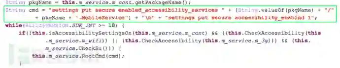 本来,该辅助功能一般由用户手动开启,但在root提权之后,SpyDealer可以实现不与用户交互的隐蔽开启。下图为SpyDealer的开启命令: