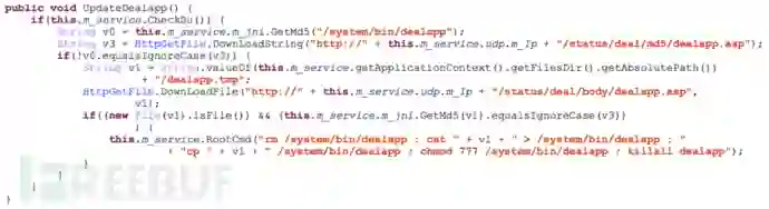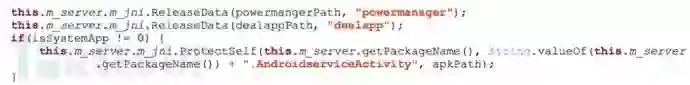该程序负责创建一个恶意软件备份文件/system/bin/update_1.apk,即使SpyDealer被卸载清除,powermanager将会把/system/bin/update_1.apk拷贝为/system/app/Update.apk,继续以系统root权限启动恶意木马进程,同时,SpyDealer核心服务AaTService也将重启执行恶意行为。代码和实现如下图所示: