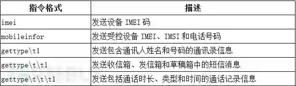 SpyDealer通过在受控手机中创建一个监听39568端口的TCP服务端,等待远程C2服务器指令。这些C2服务器与受控手机的交流指令如下表所示: