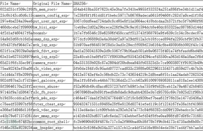 下表列出了SpyDealer滥用的全部exploit漏洞。像在raw.zip中名为022d251cf509c2f0的可执行文件exploit,在Baidu Easy Root中为gzip格式且名为fb_mem_root。