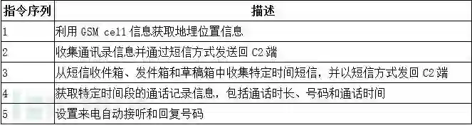SpyDealer注册了一个在默认消息应用程序之上更高优先级的广播接收器,以对目标手机短信接收指令进行监听,之后,对这些短信指令进行解析处理。每个短信指令都包含了一个指令序列和各种换行符分隔的参数引用。短信指令序列范围从1到5,指令详解如下表所示:
