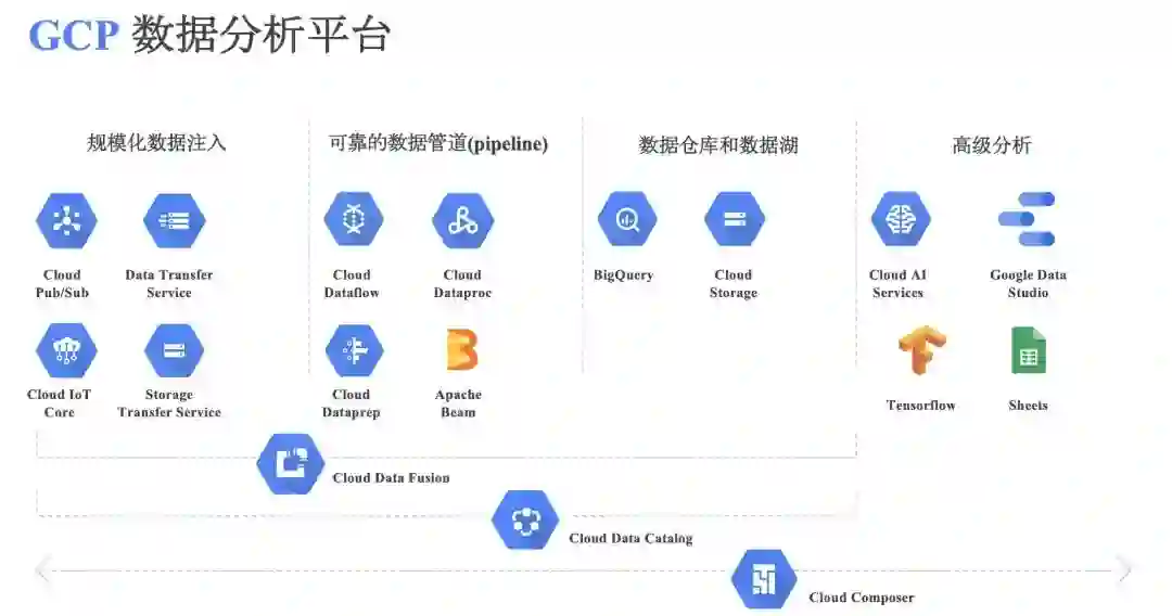 Google 在大数据领域成果颇丰,开放在 GCP 数据分析平台上,为企业提供完整数据生命周期的管理,包括规模化数据注入、数据迁移过程中的处理、数据计算和存储、到最后的高级分析预测、数据展示等。