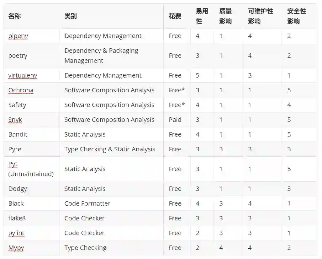 我会列出一些自己最喜欢的 python 工具,并从易用性(是否易于安装、运行和自动化)、质量影响(能否阻止可预见的 bug)、可维护性影响(是否让工作更轻松)和安全性影响(能否发现并阻止安全性问题)对它们进行打分,以供读者参考。