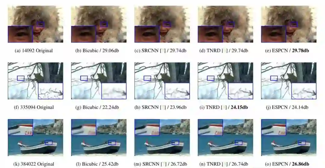 对实时视频进行超分辨率处理的实验结果也非常理想。对 1080 HD 格式的视频进行3倍放大,SRCNN 每帧需要0.435s,而 ESPCN 则只需0.038s。