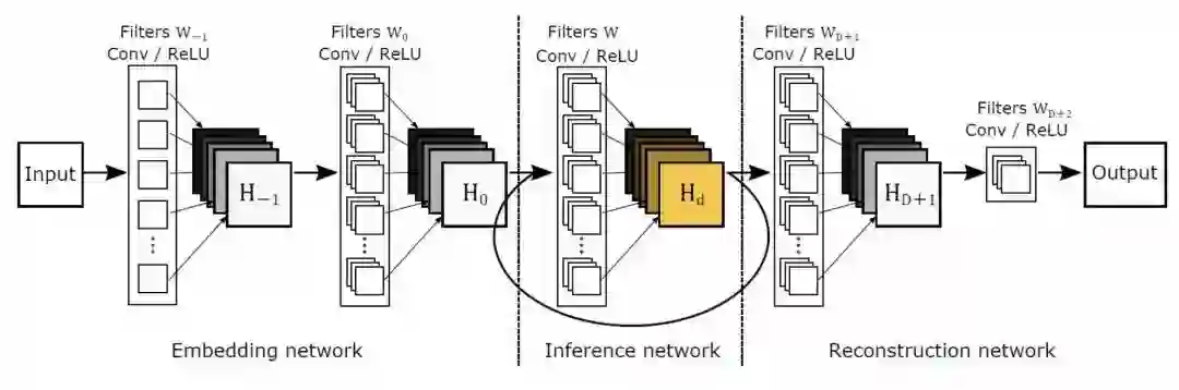 它还是分为三层。但是在非线性映射这一层,它使用了一个递归网络,也就是说,数据循环多次地通过该层。将这个循环展开的话,等效于使用同一组参数的多个串联的卷积层。