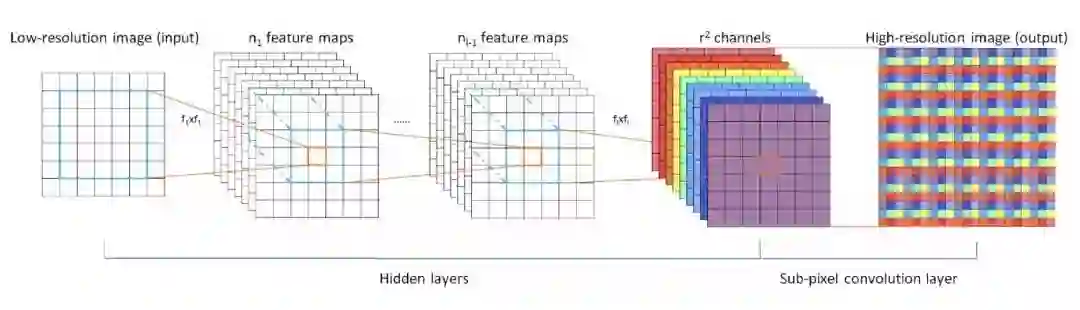这个模型是基于小图进行训练。最后提取了 r² 个 Channel。比如说,我想将图片扩大到原图的3倍,那么 r 就是缩放因子 3,Channel 为9。通过将一个像素扩充为一个3x3的矩阵,模拟为一个像素的矩阵,来达到超分辨率的效果。