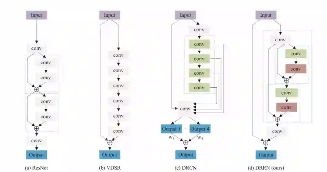 每一个卷积层都对应一个非卷积层。简单来讲,可以理解为是将一张图片进行了编码,然后紧接着进行解码。它的优势在于解决了梯度消失的问题,而且能恢复出更干净的图片。它和 VDSR 有相似的思路。中间卷积层与反卷积层的训练是针对原始图片与目标图片的残差。最后原图会与训练输出结果相加,得到高分辨率的图片。