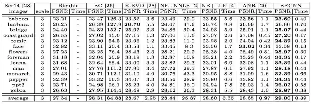 训练结果如何呢?在下表中,列出了几个传统方法与 SRCNN 方法的结果对比。最左一列是图片集,右侧分别列出了每个方法的所用训练时间和图片峰值信噪比。可以看出,尽管有些图片,传统方法得出的结果更优于深度学习,但是总体来讲,深度学习稍胜一筹,甚至所需时间更短。