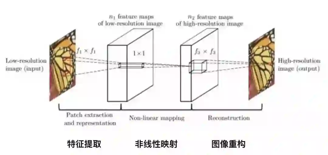 超分辨率神经网络(Super-Resolution CNN,SRCNN)是深度学习应用在超分辨率领域的首个模型。原理比较简单。它有三层神经网络,包括: