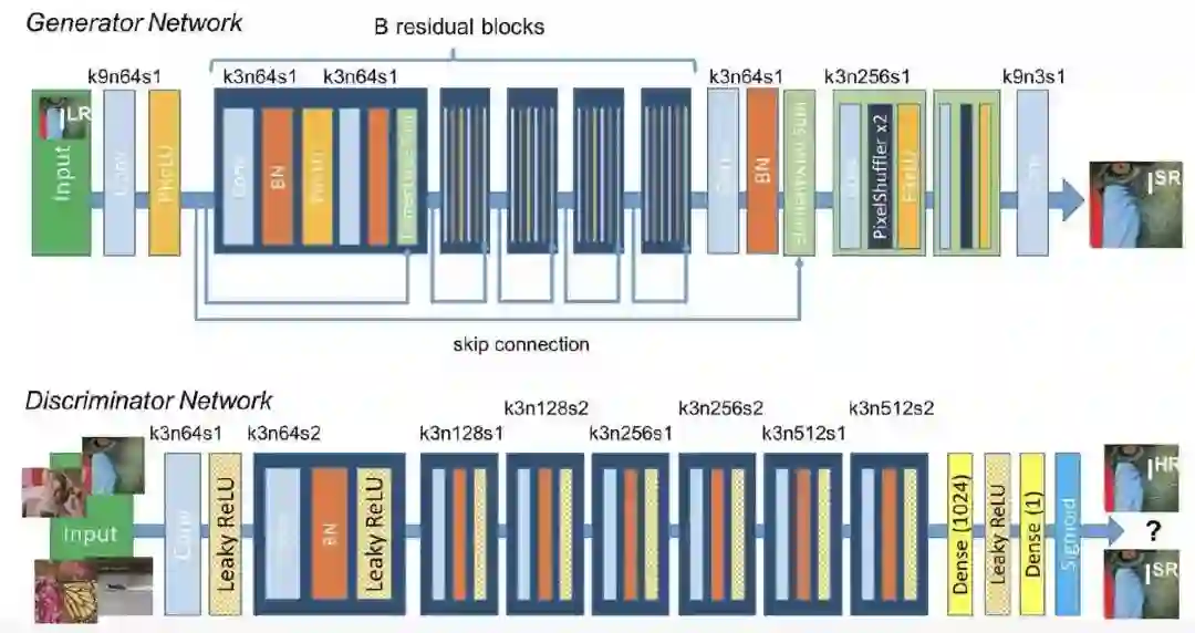 在这个模型中有两个网络,一个是生成网络,另一个是判别网路,前者会生成高分辨率图片,后者则会判断这张图是否是原图,如果结果为“否”,那么前者会再次进行训练、生成,直到可以骗过判别网络。