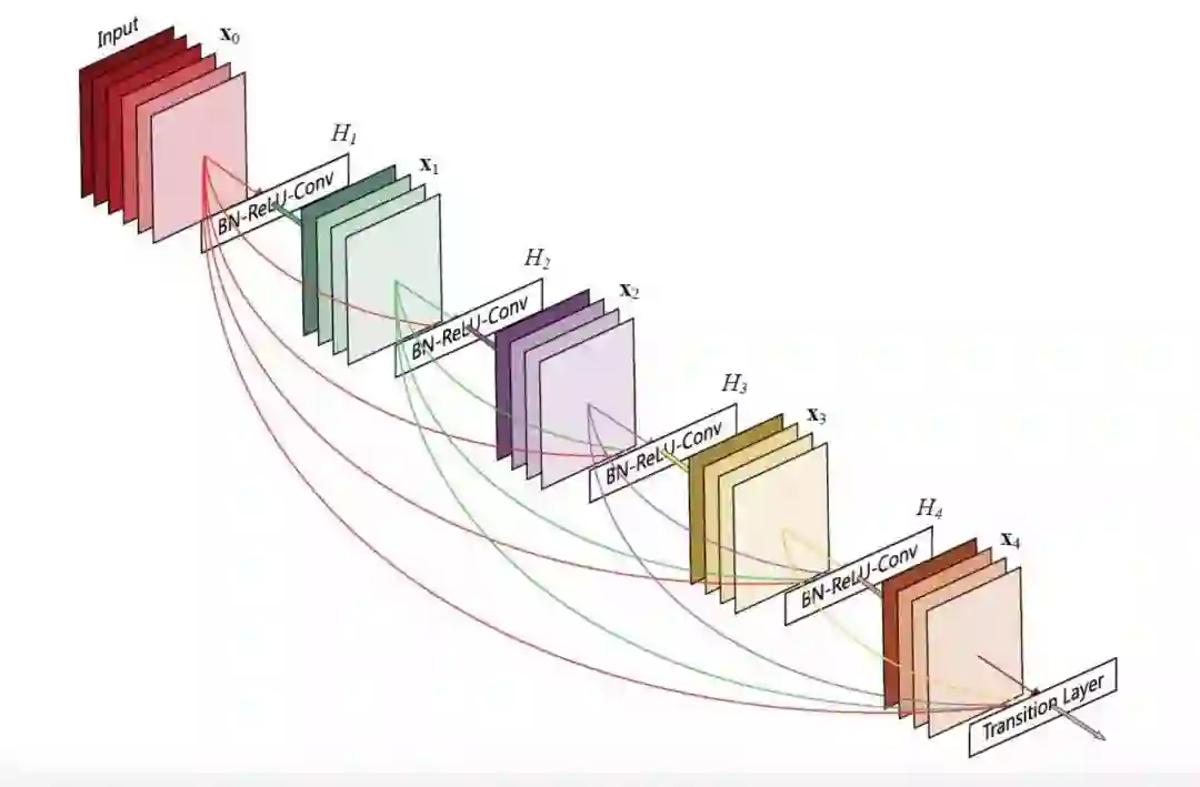 它引入了一个 Desent Block 的结构。上一层网络训练出的特征值会传递到下一层网络,所有特征串联起来。这样做的好处是减轻梯度消失问题、减少参数数量。而且,后面的层可以复用之前训练得出的特征值,不需要重复训练。