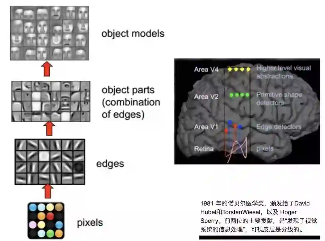 超分辨率是基于人类视觉系统提出的概念。1981年诺贝尔医学奖获奖者David Hubel、Torsten Wiesel,发现人类视觉系统的信息处理方式是分层级的。第一层是原始的数据输入。当人看到一个人脸图像时,首先会先识别出其中的点、线等边缘。然后进入第二层,会识别出图像中一些基本的组成元素,比如眼睛、耳朵、鼻子。最后,会生成一个对象模型,也就是一张张完整的脸。