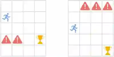 了解行为相似性。智能体(蓝色图标)需要在远离危险图标的情况下取得奖励。即便初始状态在视觉上是不同的,但就其在当前状态以及紧接着的未来状态下的最佳行为而言,它们是相似的。策略相似性指标 (PSM) 将高相似度分配给这种行为上相似的状态,将低相似度分配给不相似的状态