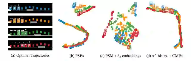 我们还对 PSEs 和基线方法学到的表征进行了可视化,通过 UMAP 将它们投射到 2D 点上,这是一种常用的高维度数据可视化技术。如可视化图像所示,PSEs 将行为上相似的状态聚集在一起,而将不相似的状态分开,这与之前的方法不同。此外,PSEs 将状态分为两组:(1) 跳跃前的所有状态;(2) 操作不影响结果的状态(跳跃后的状态)。