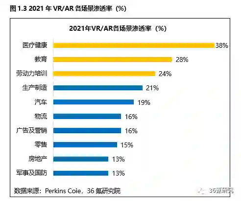 与此同时,VR/AR商业化落地场景渐趋多元。除游戏、娱乐等大众熟知的应用场景外,VR/AR逐渐涉足医疗、教育、生产制造等新领域,行业渗透率也在不断提升。根据Perkins Coie数据,2021年VR/AR在医疗健康、教育、劳动力培训、生产制造场景中的渗透率已超20%,其中医疗健康渗透率高达38%。