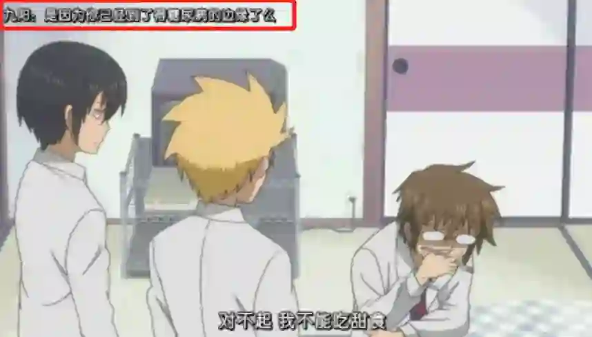 《男子高中生的日常》中的吐槽对话:“对不起,我不能吃甜食”“是因为你已经到了得糖尿病的边缘吗?”
