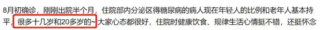 根据一些糖尿病患者的观察与自述,在医院住院部的内分泌区,得糖尿病的年轻人与老年人的比例基本持平。