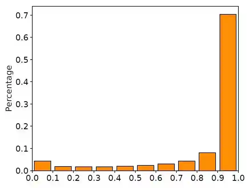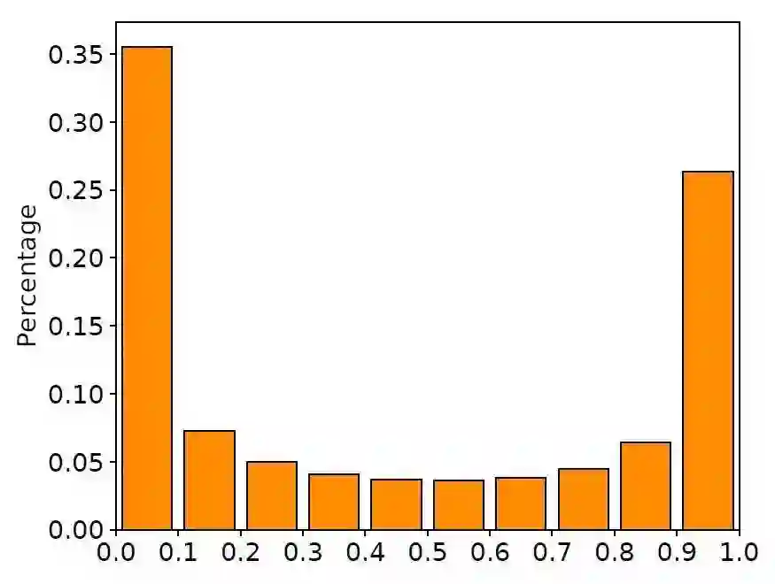 除了比较数值实验结果外,我们进一步地观察了模型中门的取值,用同样的语料画出了我们的模型中门的取值分布直方图,如下图所示。