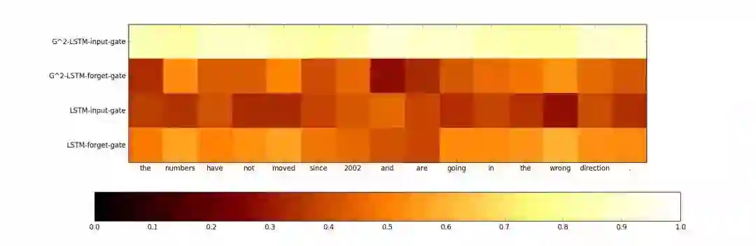 从图中可以清晰地看到,很大一部分门的取值都在0.5附近。换句话说,LSTM中的门都处于一种模棱两可的“半开半关”的状态。这种现象与LSTM网络的设计有所出入:这些门并没有显式地控制信息的记忆与遗忘,而是以某种方式“记住”了所有的信息。与此同时,许多工作也指出LSTM中的大部分门都很难找到实际意义,这也进一步印证了我们的发现(相关讨论详见文末论文)。
