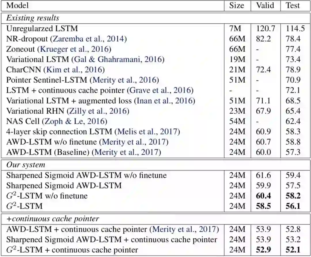 从图中可以看到,通过将LSTM中的门进行“二值化”,模型的表现有所提升:我们模型的perplexity为56.1,与基线模型的perplexity57.3相比,有1.2的提升。而在加入了测试时后处理(continuous cache pointer)的情况下,我们的模型达到了52.1,较基线模型的52.8有0.7的提升。