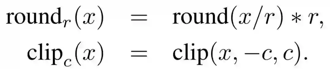 精度压缩。我们首先限制了参数的精度(使用round函数),例如当公式中的r取0.1时,所有的模型参数都仅被保留一位小数精度。在这之后,我们进一步控制了参数取值的范围(使用clip函数),将所有取值大于c的参数都变为c,将所有取值小于-c的参数都变为-c。由于两个任务的参数取值范围不太相同,在语言模型上,我们设置r=0.2,c=0.4;在机器翻译上,我们设置r=0.5,c=1.0。这使得所有的参数最终将只能取5个值