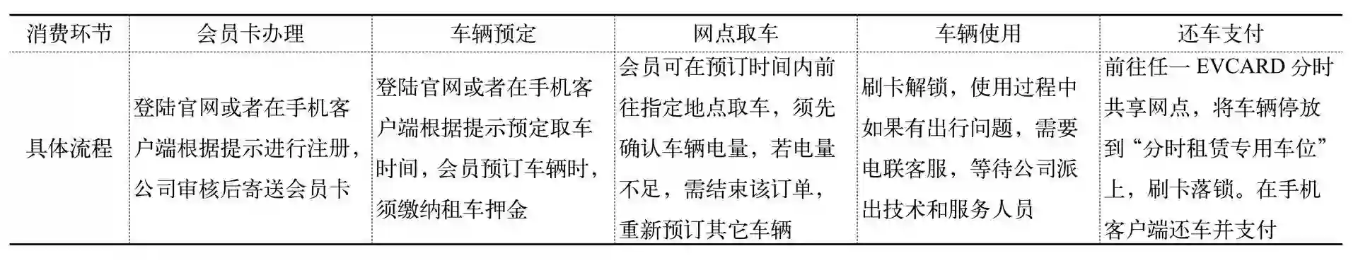 在具体的消费环节,客户需要完成「会员卡办理→车辆预定→网点取车→车辆使用→还车支付」5 个 流程,如表 2 所示。