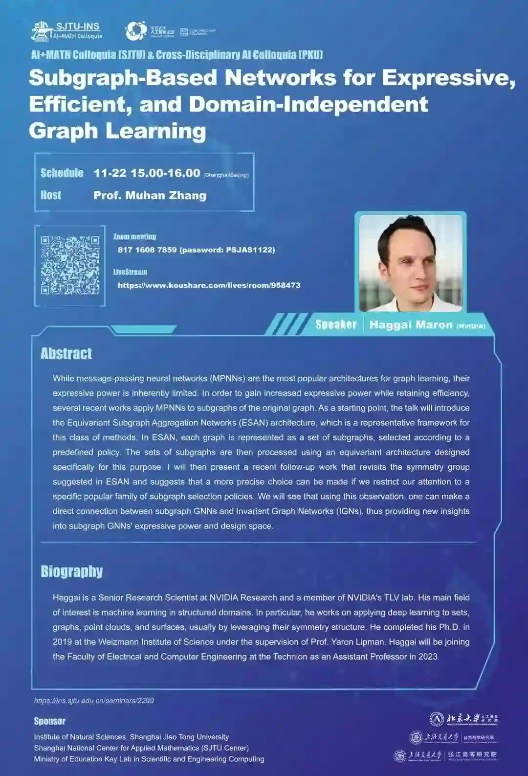 周二(11月22日)下午3点,NVIDIA科学家Haggai Maron做客北大-交大AI联合研讨会,欢迎通过zoom或蔻享学术平台参与讨论! https://ins.sjtu.edu.cn/seminars/2229
