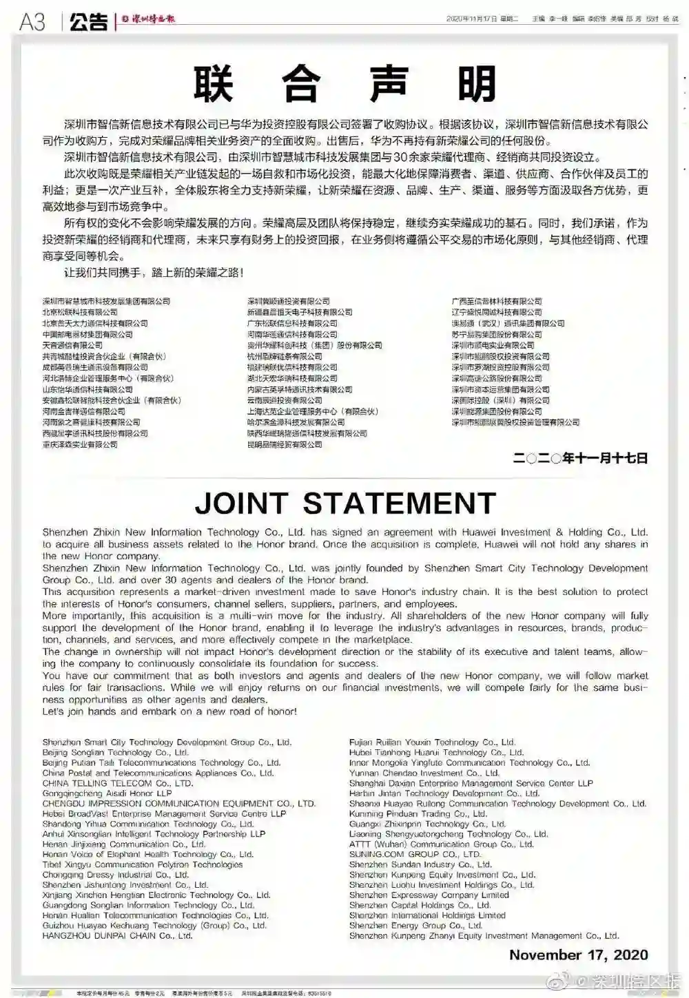 多家企业在发布联合声明,深圳市智信新信息技术有限公司已与华为投资控股有限公司签署了收购协议,完成对荣耀品牌相关业务资产的全面收购。出售后,华为不再持有新荣耀公司的任何股份。深圳市智信新信息技术有限公司,由深圳市智慧城市科技发展集团与30余家荣耀代理商、经销商共同投资设立,包括天音通信有限公司、苏宁易购集团股份有限公司、北京松联科技有限公司、深圳市顺电实业有限公司等。