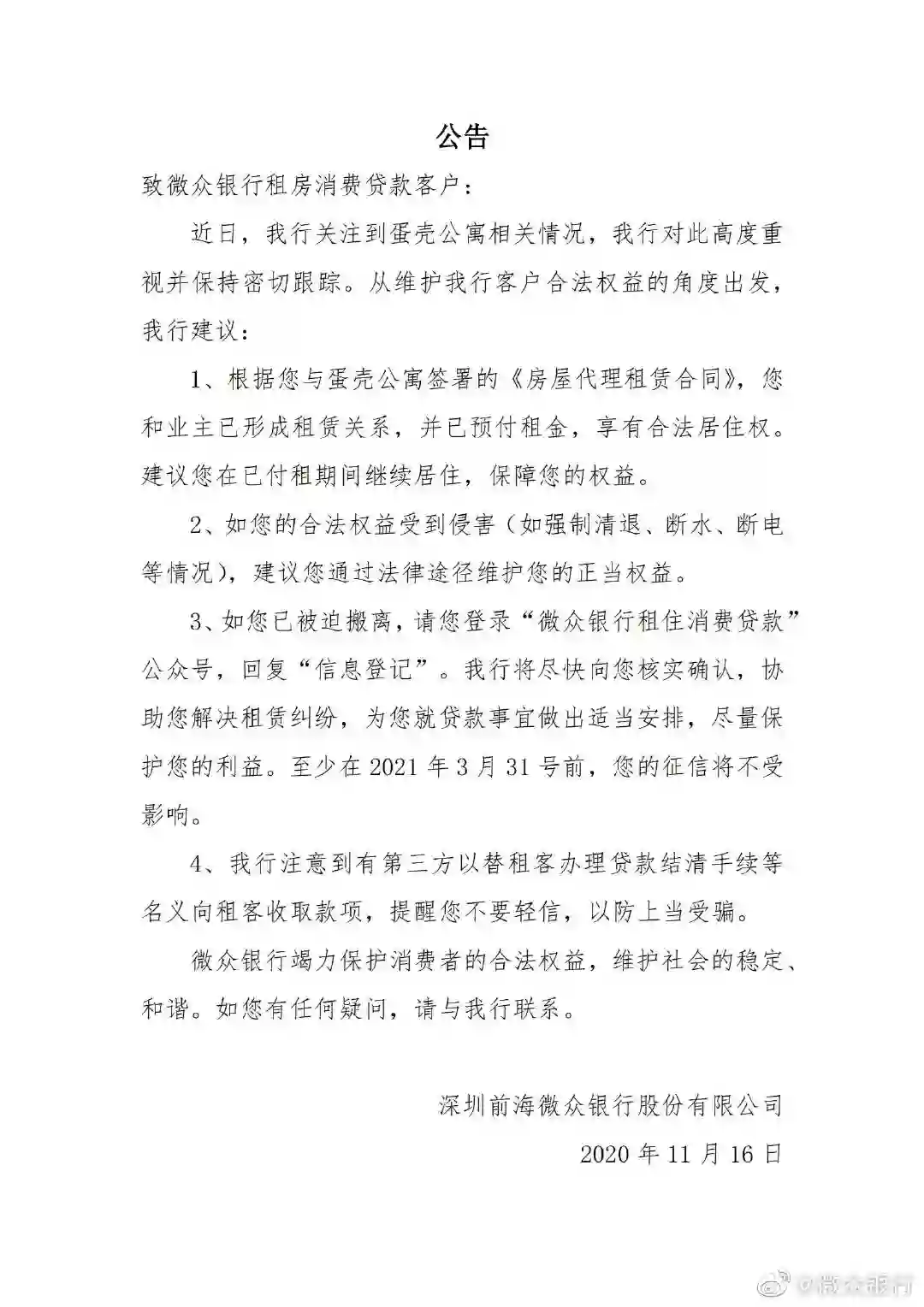 近日,对于蛋壳公寓近日爆出经营困局,与蛋壳合作“租金贷”业务的微众银行表示,建议客户再已付期间继续居住,保障合法权益。如果客户合法权益收到侵害(如强制清退、断水、断电等情况),建议通过法律途径维护正当权益。如客户已被迫搬离,该行将做出适当安排,尽量保护客户权益,至少在2021年3月31日前,征信将不受影响。(21财经)