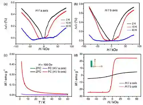 王玉霞等利用溶液缓慢蒸发法合成出一种[Dy(L)2(C2H5OH)Cl3]·C2H5OH单分子磁体单晶样品,尺寸可以达到毫米量级,为电学测量打下了基础。在该晶体中,强自旋-轨道耦合的Dy离子处于轻微畸变的八面体配位场中,具有单轴各向异性,有利于形成单分子磁体。通过交流磁化率和直流磁化强度的测量,确定了该单分子磁体的低温磁性弛豫行为和磁各向异性。在此基础上,马怡妮娜利用孙阳研究组自主研制的多功能磁电耦合测量系统,仔细测量了该单分子磁体不同晶向的介电常数随温度和磁场的变化。在低温下(2—40 K),其介电常数随磁场增加而上升,到8T磁场时依然没有饱和,表现出显著的磁介电效应。该效应被认为是来源于高自旋态的三价Dy离子,具有较强的自旋-晶格耦合,外加磁场导致局域晶格的收缩,进而产生电容的变化。这是首次在单分子磁体中观察到磁介电/磁电容效应,预示着在单分子磁体中也有望实现本征磁电耦合效应。未来,研究者将通过结构设计,尝试在单分子磁体中通过打破空间反演对称引入铁电极化,从而进一步增强单分子磁体中的磁电耦合效应,最终实现电场对单分子磁体磁性的调控。