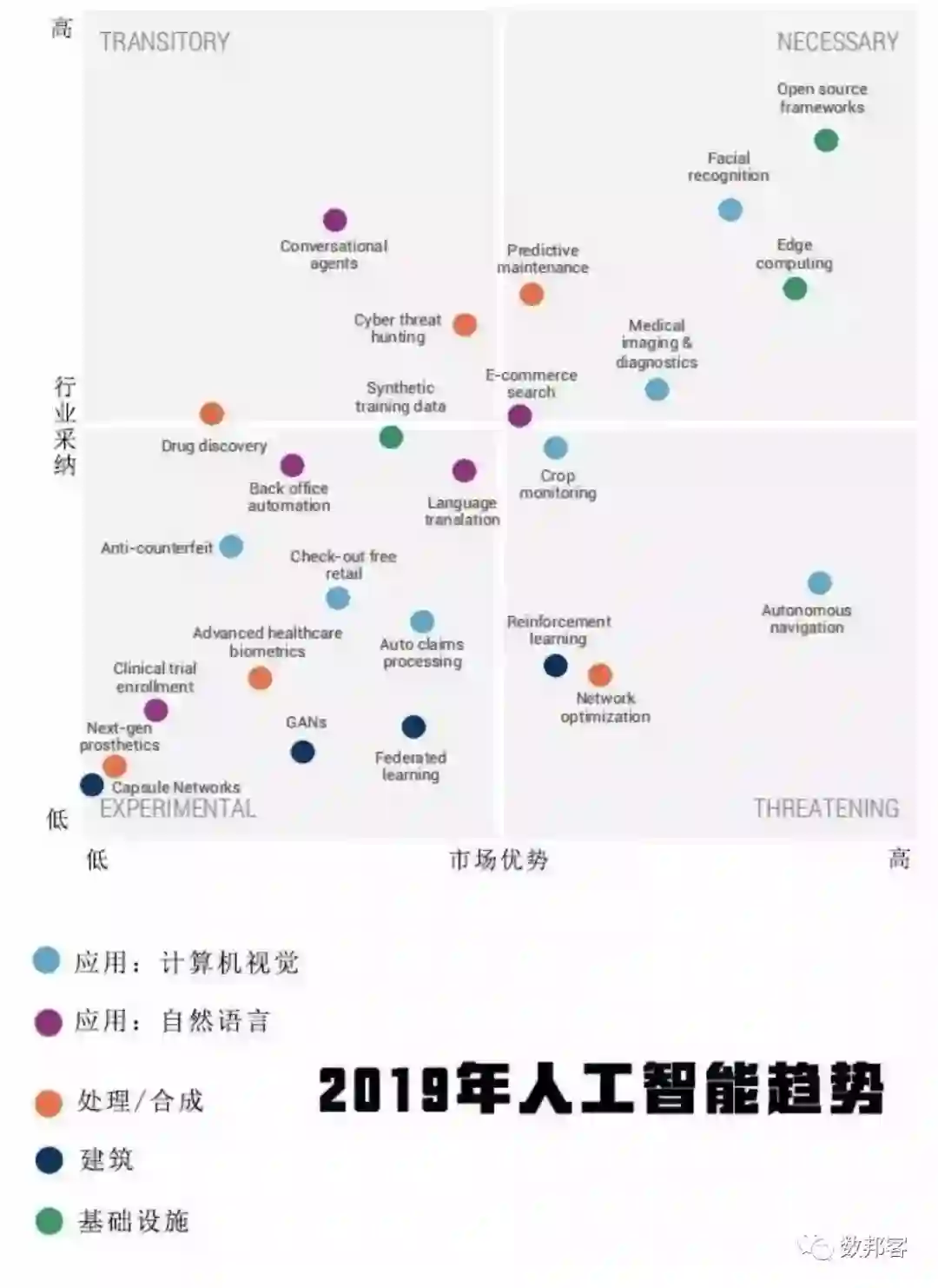 知名创投研究机构CB Insights调研了25种最大的AI趋势,以确定2019年该技术的下一步趋势,他们根据行业采用率和市场优势评估了每种趋势,并将其归类为必要、实验性、威胁性、暂时的。
