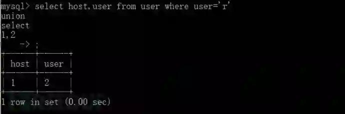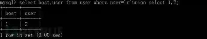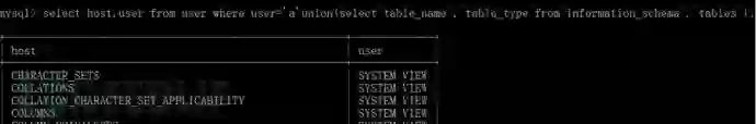 select host,user from user where user='a'union(select*from((select`table_name`from`information_schema`.`tables`where`table_schema`='mysql')`a`join(select`table_type`from`information_schema`.`tables`where`table_schema`='mysql')b));