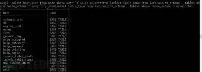 select host,user from user where user='a'union(select*from(((select(table_name)from(information_schema.tables)where(table_schema)='mysql')a)join(select(table_type)from(information_schema.tables)where(table_schema)='mysql')b));