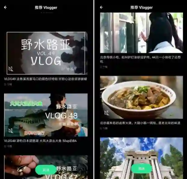 在动态页面,可以浏览已经关注的Vlogger动态,在顶端有“发现更多优质博主”的推荐入口,点击进入后,可以浏览系统推荐的博主的动态。